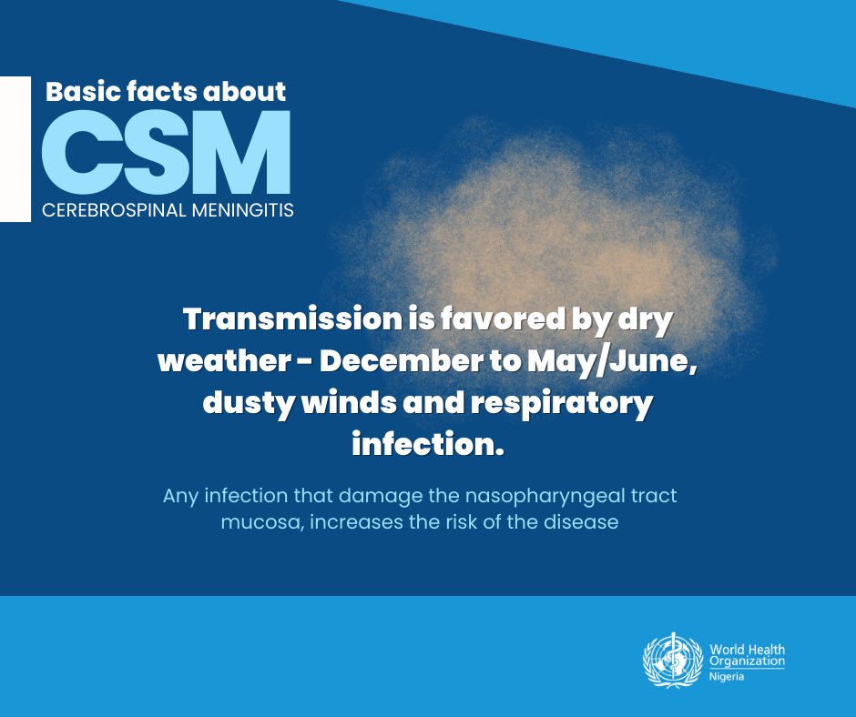 RT @WHONigeria: Transmission of #CSM is favored by dry weather between December to May/June, dusty winds and respiratory infection. https:/…